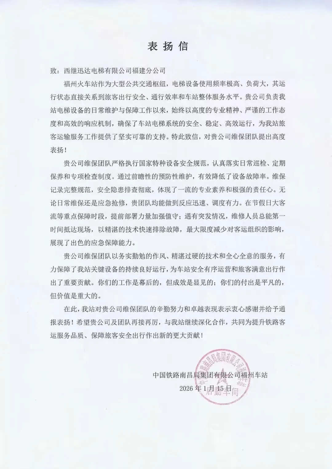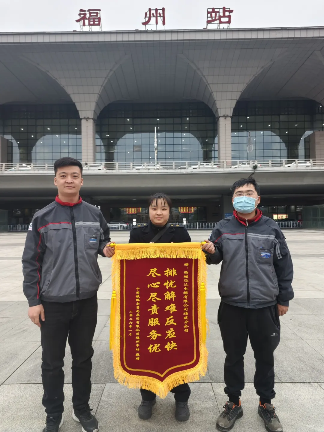 近日,西继迅达电梯有限公司收到了来自中国铁路南昌局集团有限公司福州车站的一份特殊荣誉:一面绣有 “排忧解难反应快 尽心尽责服务优” 的锦旗及一封情真意切的表扬信,这不仅是对公司维保团队专业能力与服务精神的高度肯定,更是对西继迅达品牌价值的有力彰显。